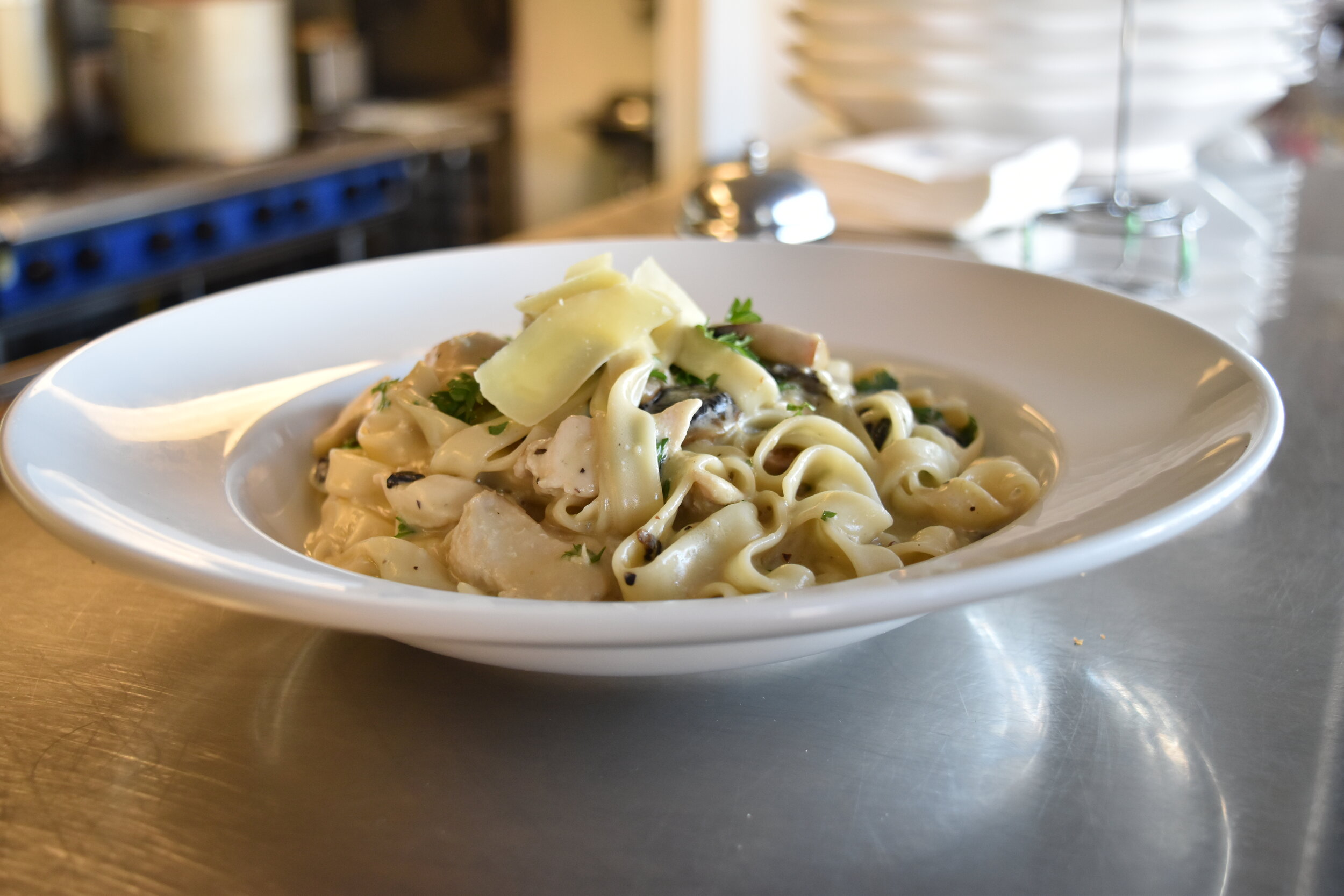 One of the signature dishes on our menu are definitely chicken fetuccine. Perfectly cooked fetuccine with creamy sauce, chicken and mushrooms, olive oil, garlic and fresh herbs.